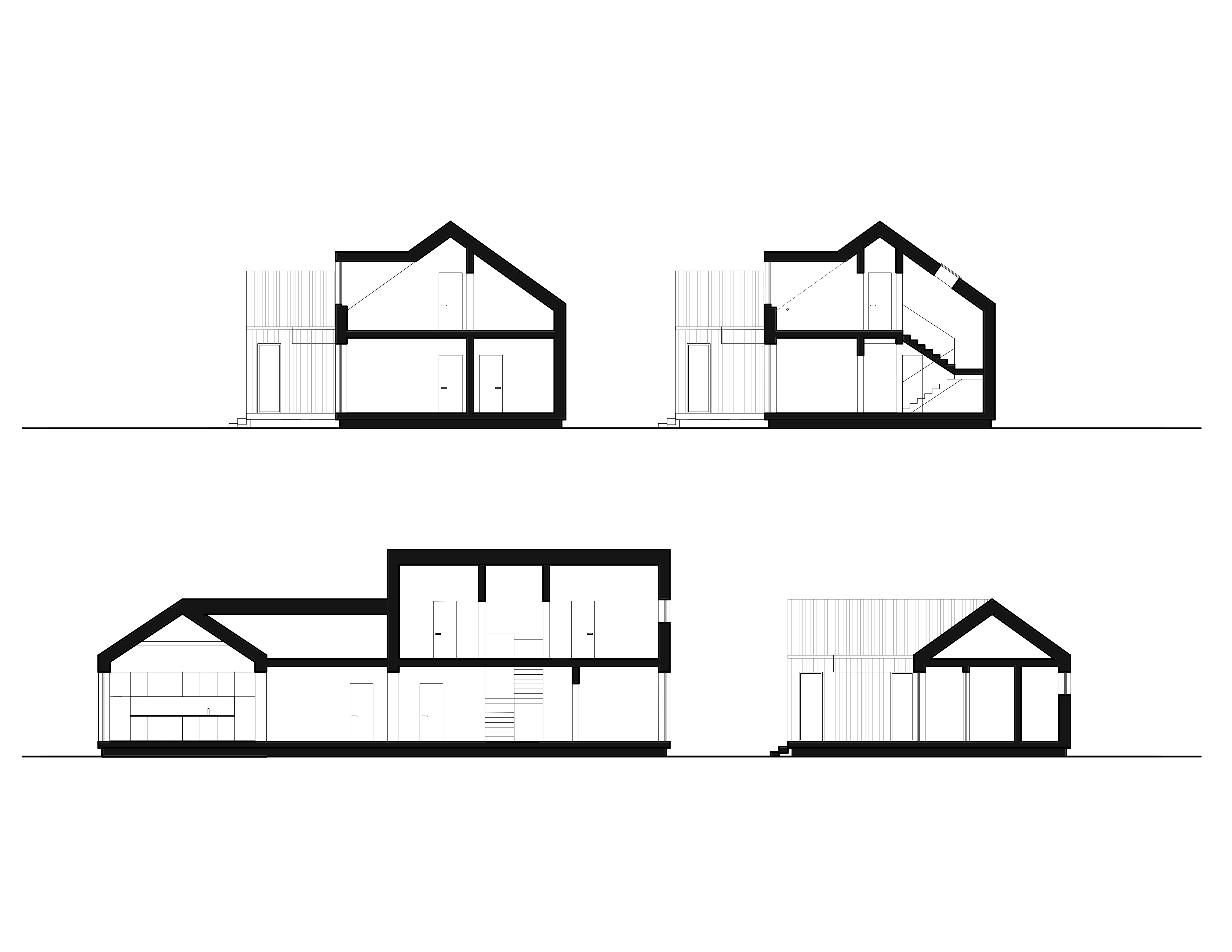 A spacious open-plan kitchen and living room fully occupies one wing of the house. The opposite wing houses two home offices and a guest bedroom. On the second, attic floor, there is a master bedroom, a children’s room, and a bathroom with a view of the forest. All rooms include built-in closets, storage spaces, or walk-in wardrobes.